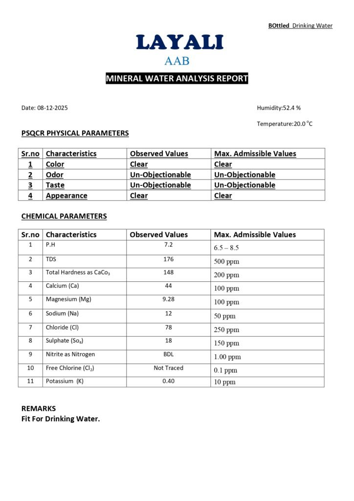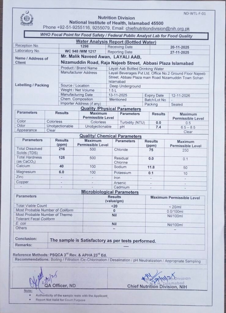 Our Certificates At Layali Aab, your safety and trust come first. This is why our water is tested, approved, and fully registered with the Government of Pakistan.Below you can see all the certificates that prove our water is safe, clean, and legally approved. Our Partners